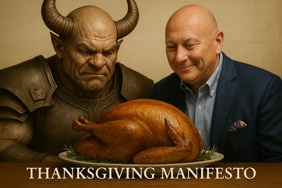 Multiply the Sides Like Your Empire Pat: A proper feast has three categories of sides: Starches, Greens, and Reckless Indulgence. Only fools serve fewer than nine total. Clark: Okay, maybe nine is excessive, but having a variety matters. Mashed potatoes, stuffing, one or two veggies, and at least one chaotic dessert. Remember the four basic food groups: Bagged, boxed, bottled, and canned. Time Your Attack Pat: A warlord who loses track of time will serve stuffing at midnight. Align every dish like troops in formation, and squash rebellion quickly. Clark: Create a schedule.